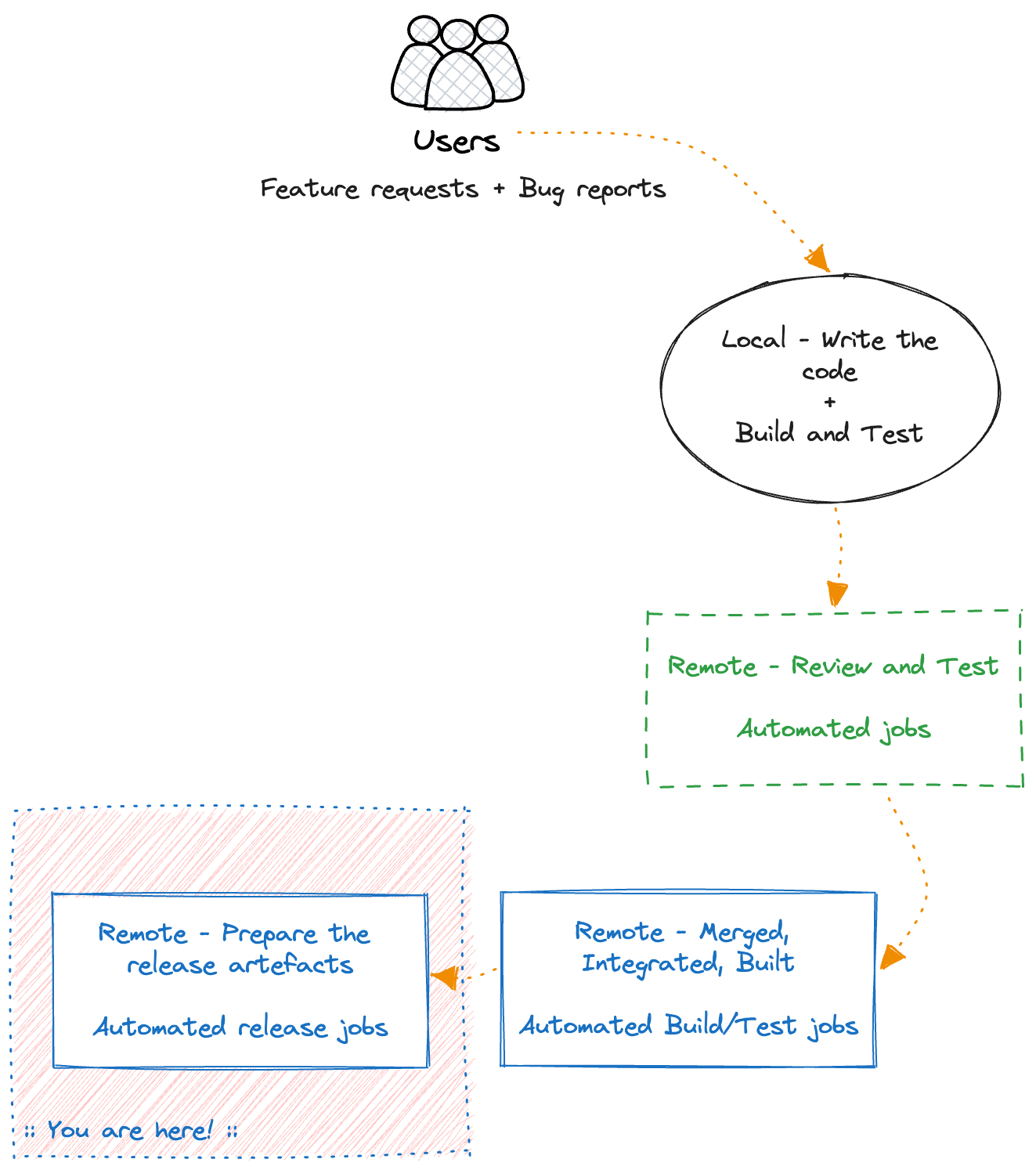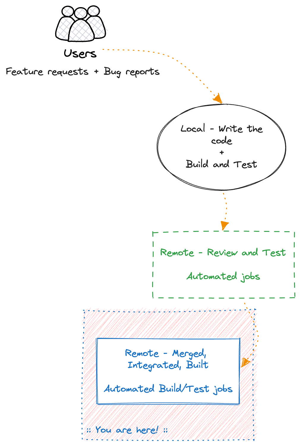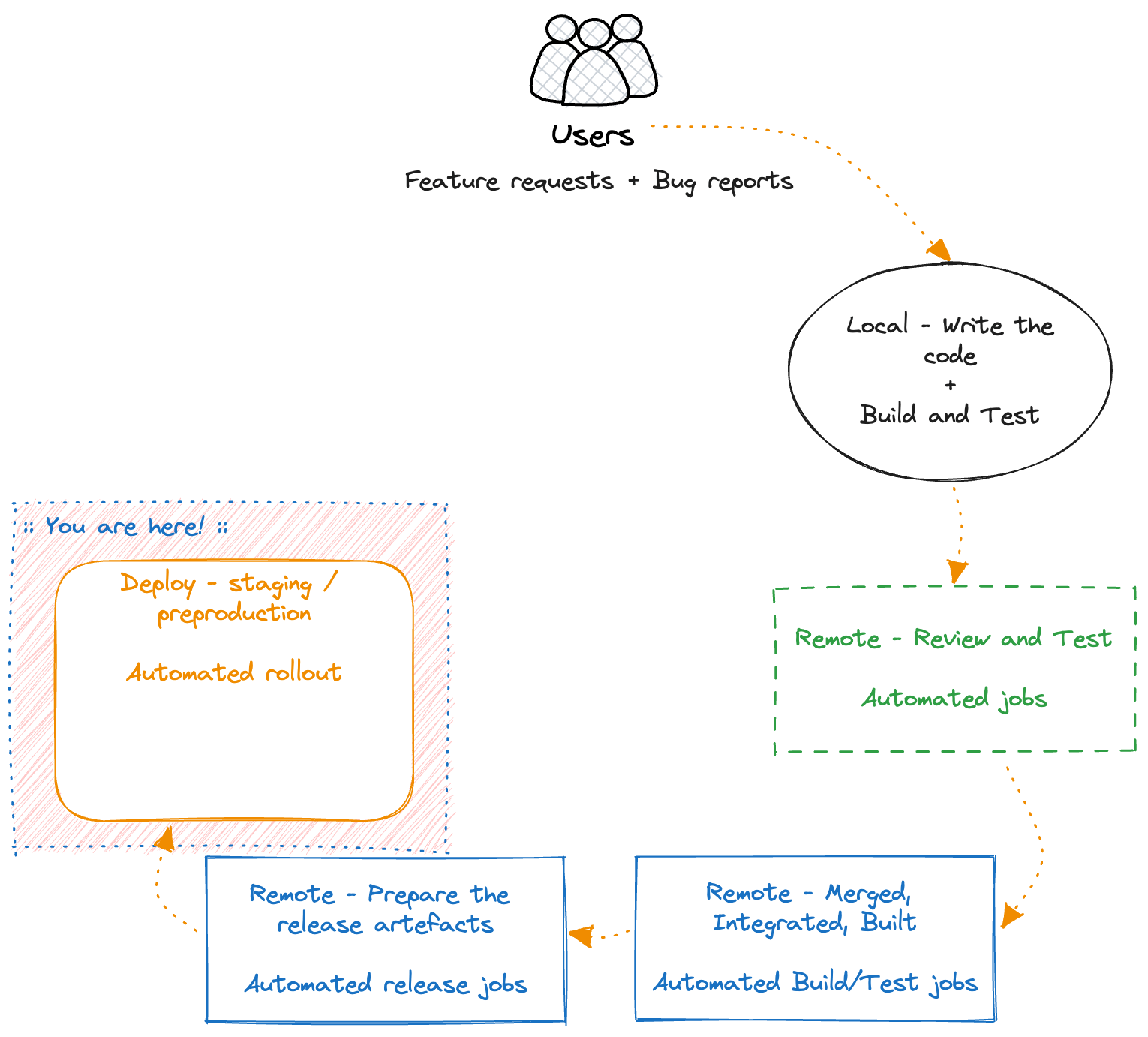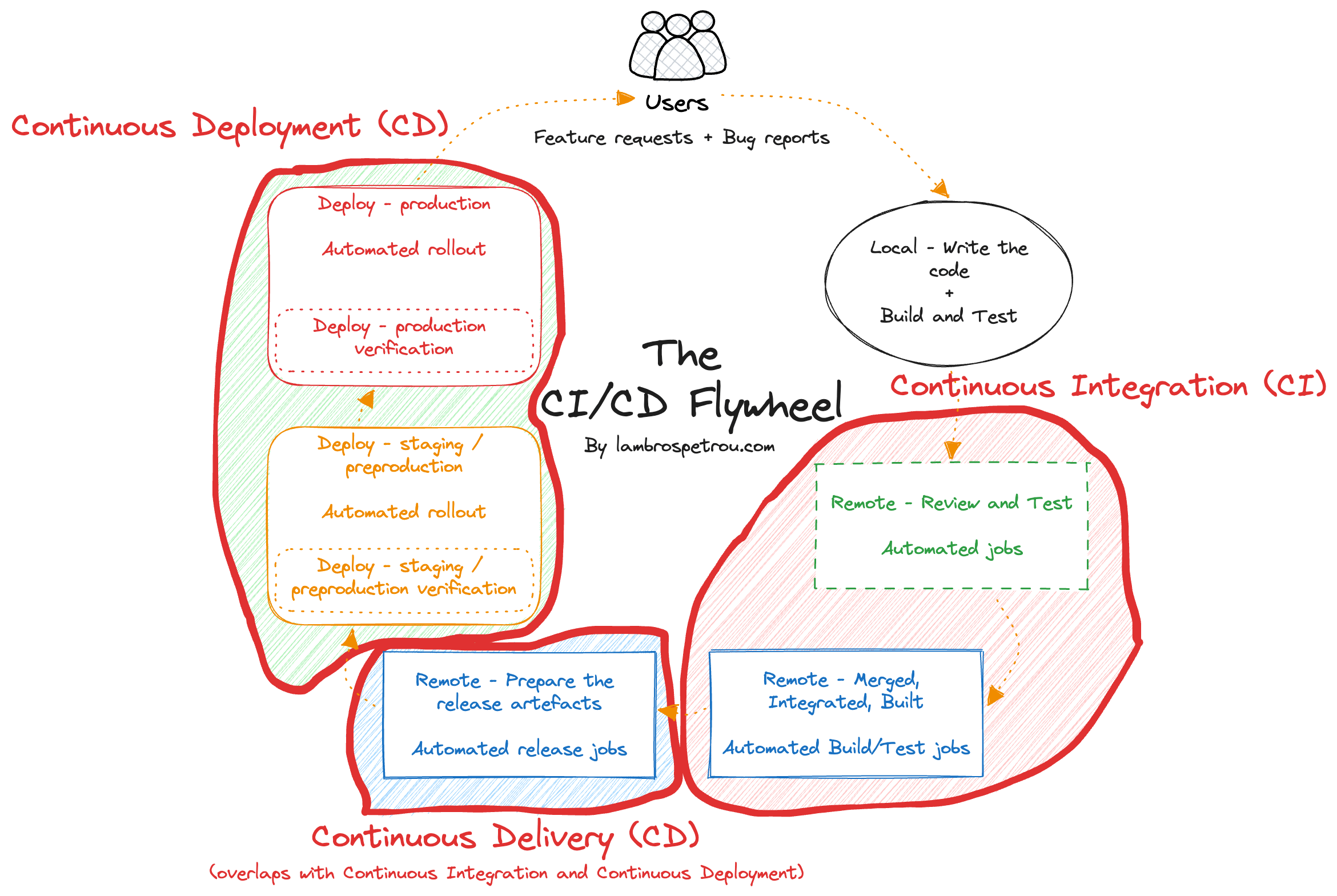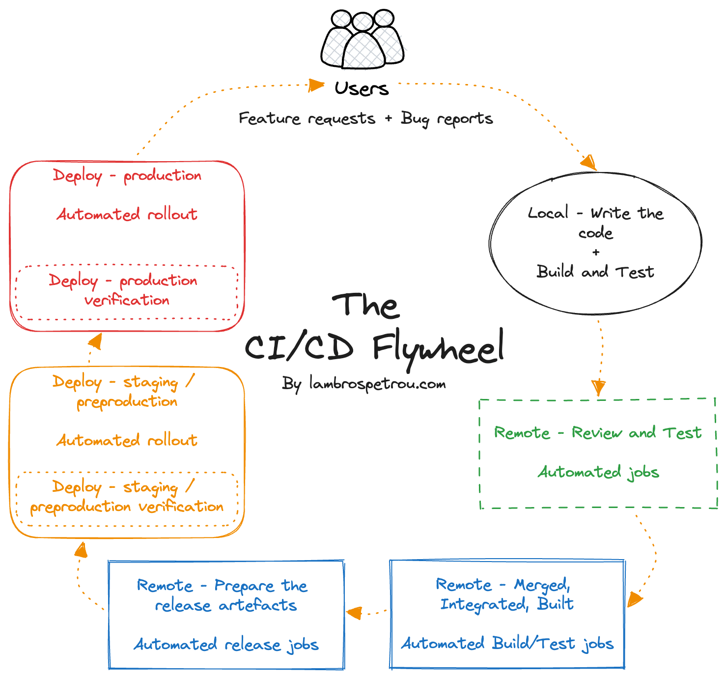 The full flow is what I call The CI/CD flywheel, and as we will see at the end, all the steps of the flywheel are what a CI/CD pipeline implements.