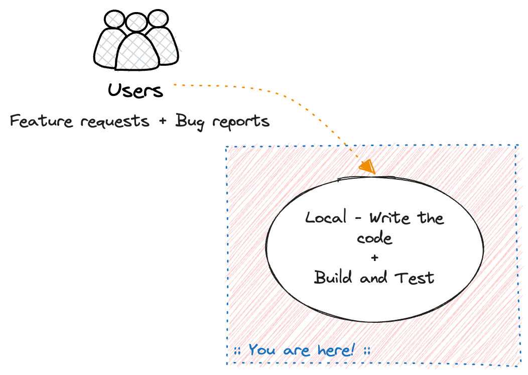 Let’s step through the full development and release lifecycle of releasing a traditional web application. We start by writing code, testing it, building it, shipping it to production, and making sure it works as we expect.