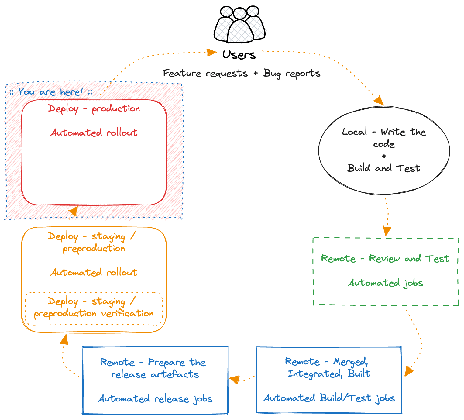 - After a few hours, or days, the QAs approve, and we now ship the change to production.