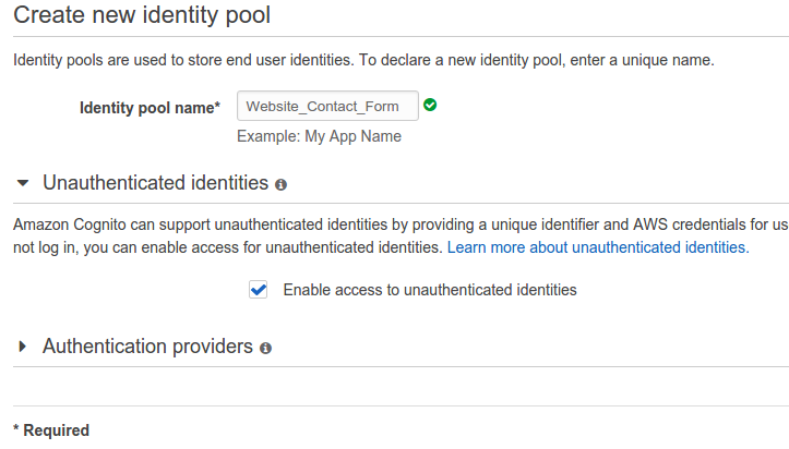 Type in a name for your pool (i.e. Website_Contact_Form) and enable Unauthenticated identities.