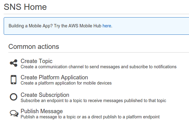 SNS is a bit longer procedure but nothing complex. The philosophy behind SNS is that you have a topic (endpoint) with some publishers and some subscribers. When a publisher posts something to that topic then all the subscribers are notified automatically by the service with the newly published message. I guess by now you should have figured out that the subscriber to our SNS topic will be our email and the publisher of the topic will be our website.