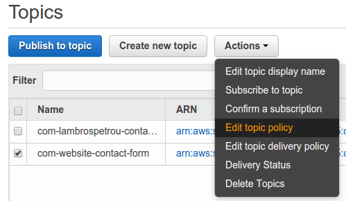 { "Sid": "__console_pub_0", "Effect": "Allow", "Principal": { "AWS": "*" }, "Action": "SNS:Publish", "Resource": "arn:aws:sns:eu-west-1:717437904155:com-website-contact-form", "Condition": { "StringLike": { "aws:Referer": [ "https://www.lambrospetrou.com/*", "https://lambrospetrou.com/*" ] } } }The above configuration adds the Condition to the existing rule which is what is restricting access to the Publish permissions of the topic only to our domain. Make sure that you use your own Resource arn url which can be found in the topics details page and also your own domains.