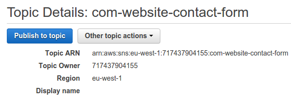 Select Create Topic and then just fill out the Topic name with whatever you want (i.e. com-website-contact-form). You should now see the Topic Details page for your new topic (similar to the picture below).