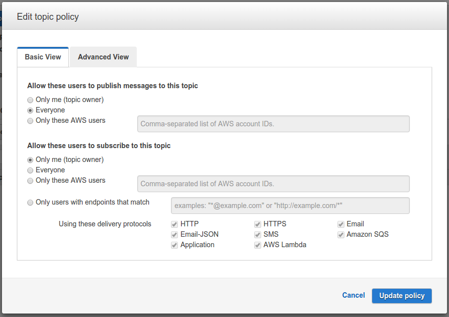 From the list of topics select the one we created before, then click at Actions and from the dropdown select Edit topic policy.