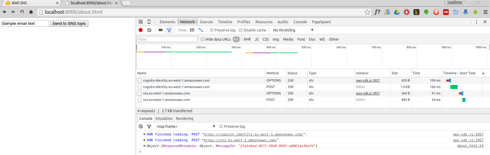 I will explain the implementation in three steps, a) Amazon Cognito, b) SNS and c) Securing our SNS topic to allow only publishings from our website domain.