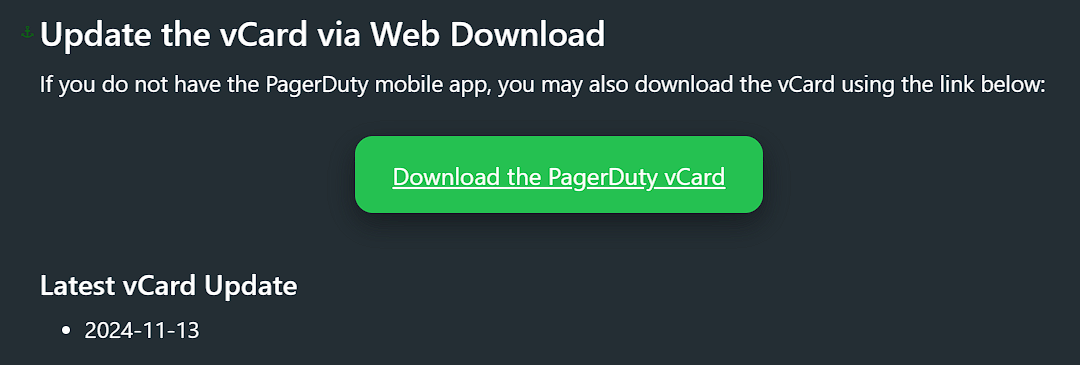 The website PagerDuty vCard Updates has a section listing the latest version of the PagerDuty vCard Update as a date, e.g. 2024-11-13.