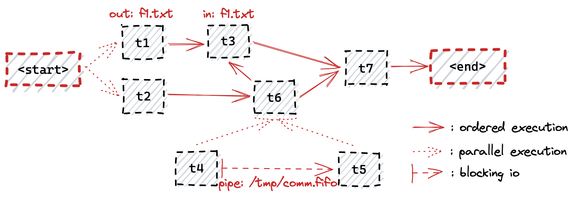 t1/t3‘s execution flow, oncet2completes it will triggert6, butt6depends ont4andt5targets to have been completed first. t4andt5execute in parallel, and the output oft4is being read byt5through the file pipe/tmp/comm.fifo. Note that this is blocking communication, meaning that in order fort4to manage to finish,t5must also run in parallel to consume the content produced byt4.- Once