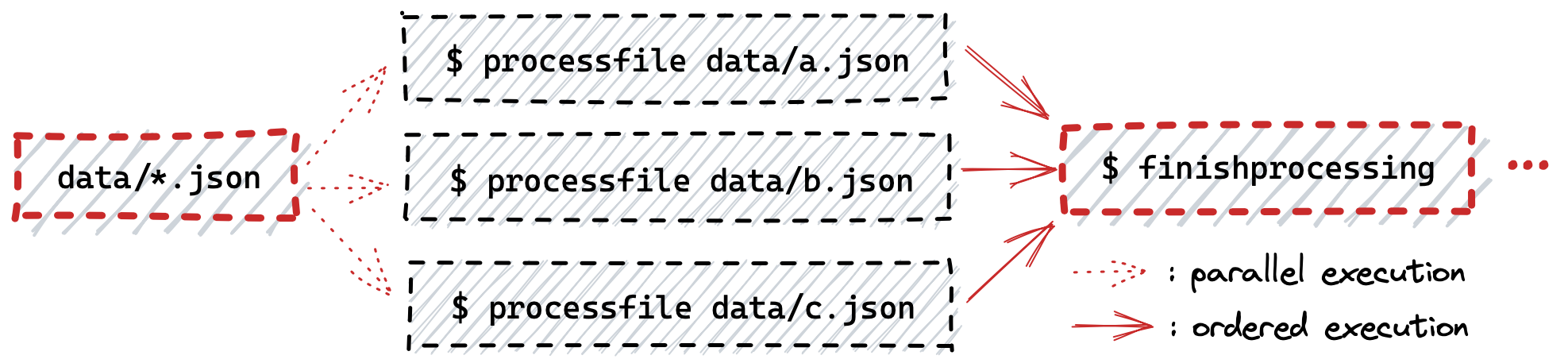 data/. For each JSON fileFwe want to call some commandCthat will processF. This ideally should be done in parallel since there could be lots of files. - Once all the files are processed, run another command which can continue the workflow execution.