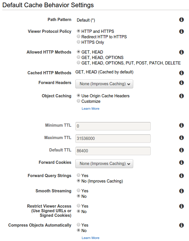 - The only option you might want to change for now is the Forward Query String depending on whether your website uses query strings from users. By default Cloudfront will just strip out the query string before forwarding the request to S3 so enable this if your want it.