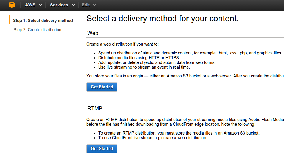 Click Create Distribution and then click Get Started under the Web section (see picture below).