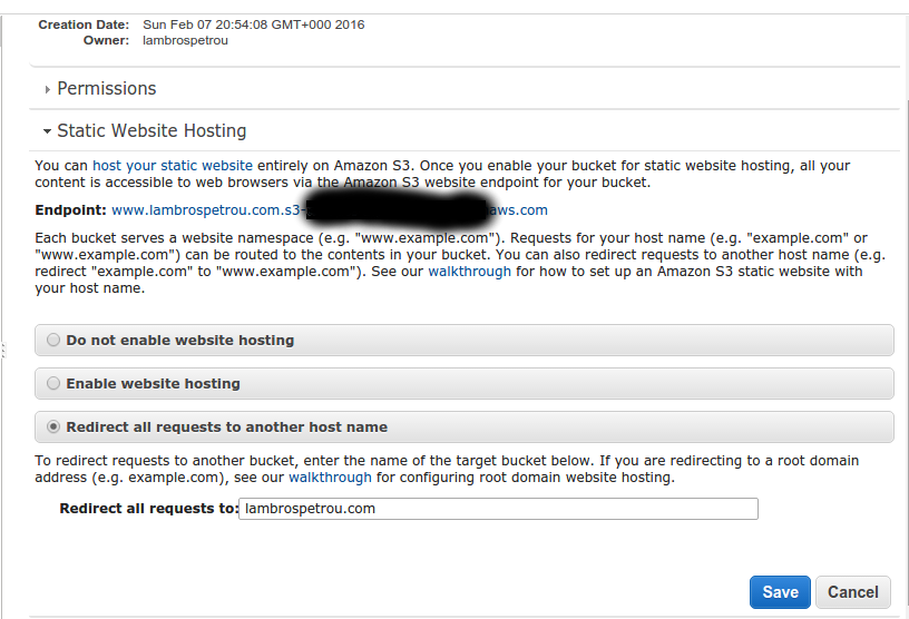 In this section I will describe how we can make all requests to www.lambrospetrou.com to be redirected to lambrospetrou.com. Again we only need to use Amazon S3 for this part. The idea is very simple. We will create another bucket named www.lambrospetrou.com but now instead of putting files into this bucket we will specify redirection rules to the bucket we created before.