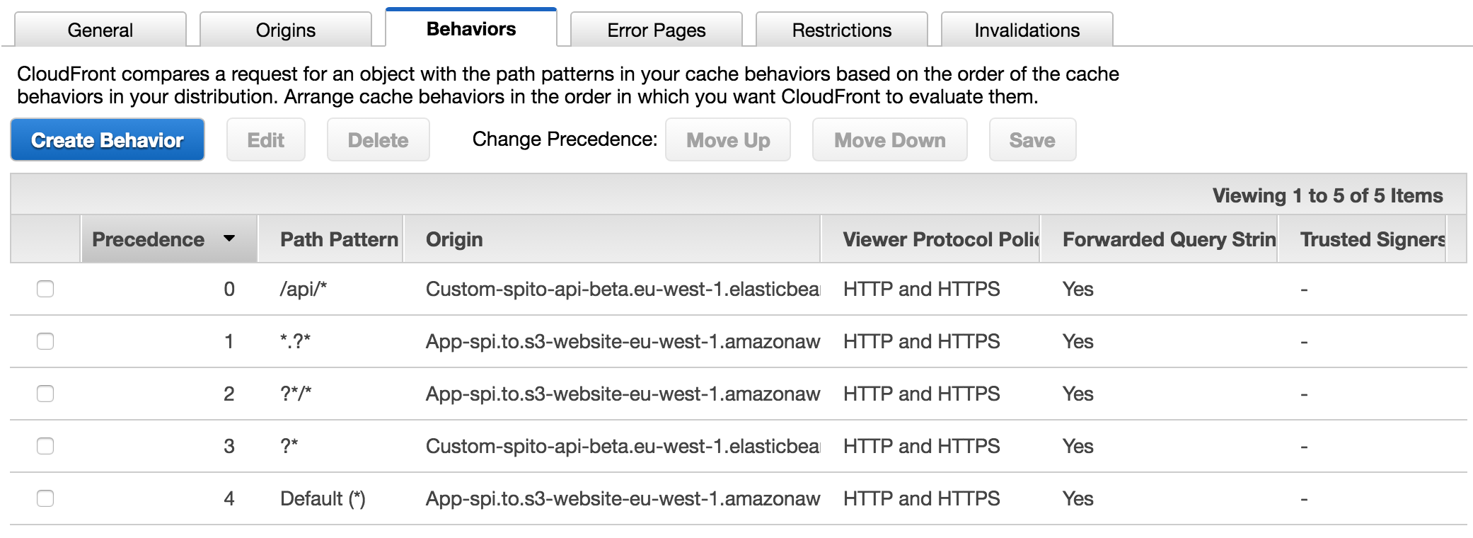 In cloudfront I specify certain behaviors for caching depending on the files but I also include some path patterns to direct each request to the appropriate backend (S3 or API). You can see below a snapshot of the rules I have at the moment.